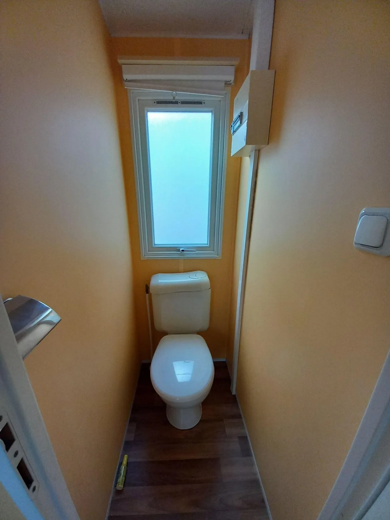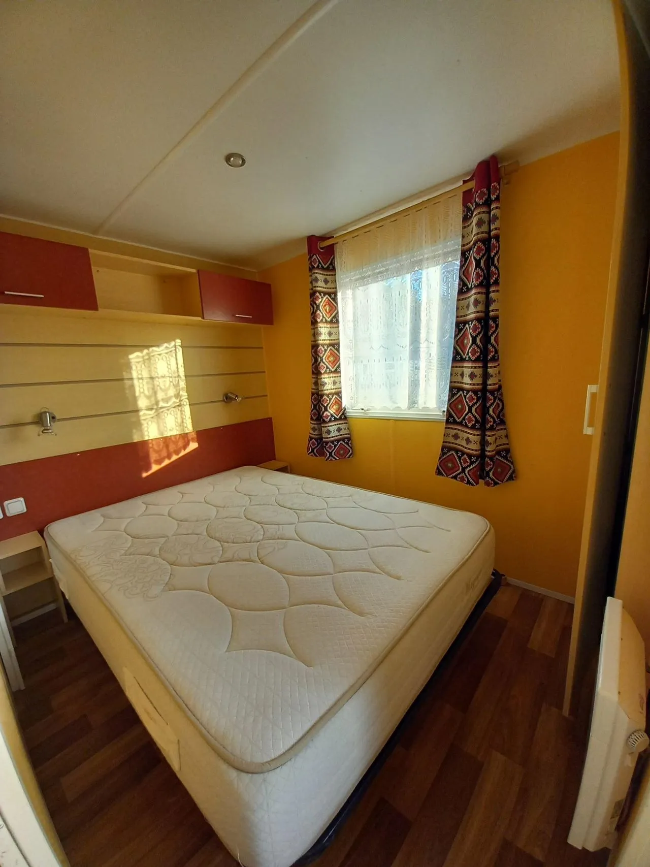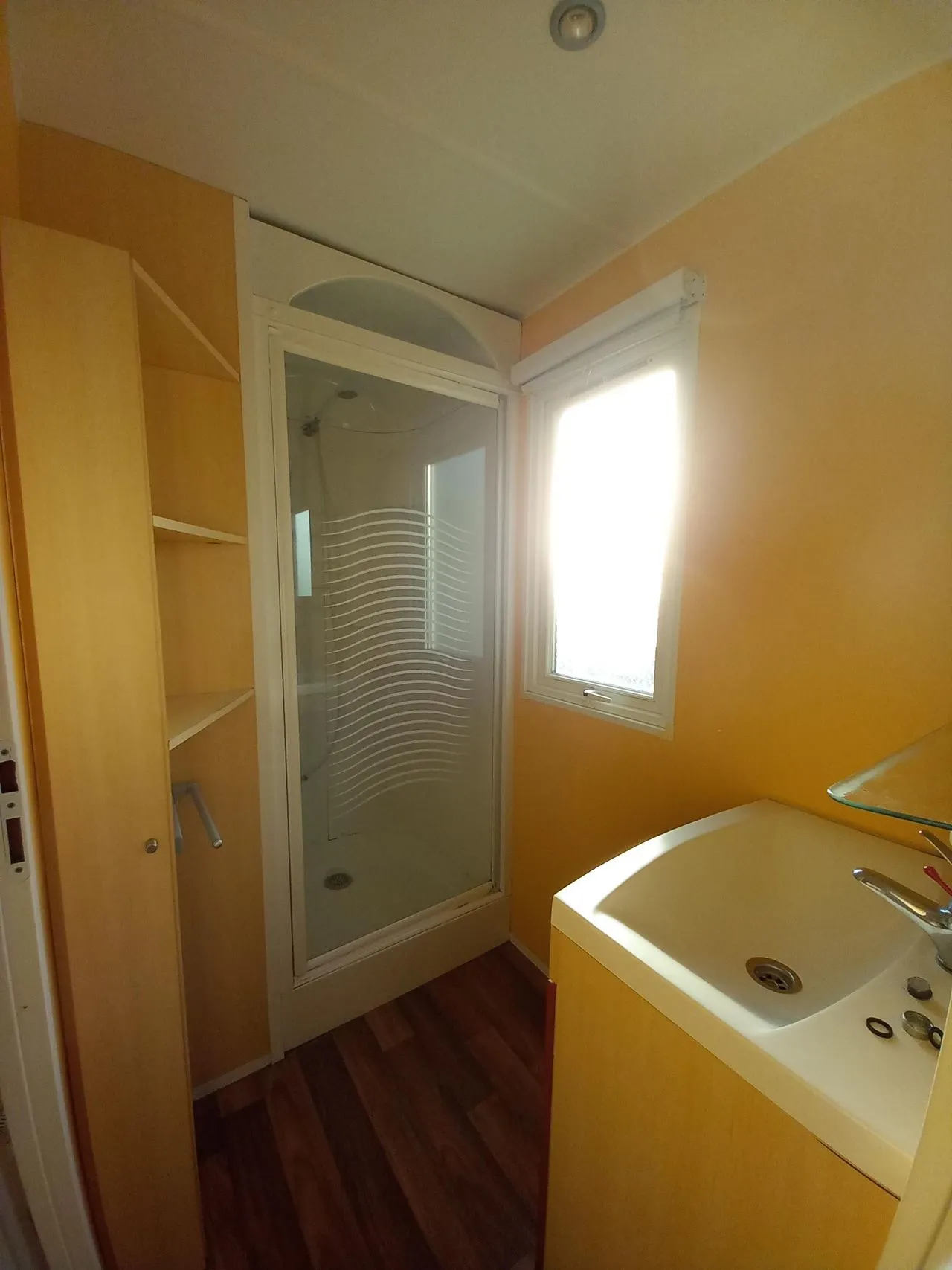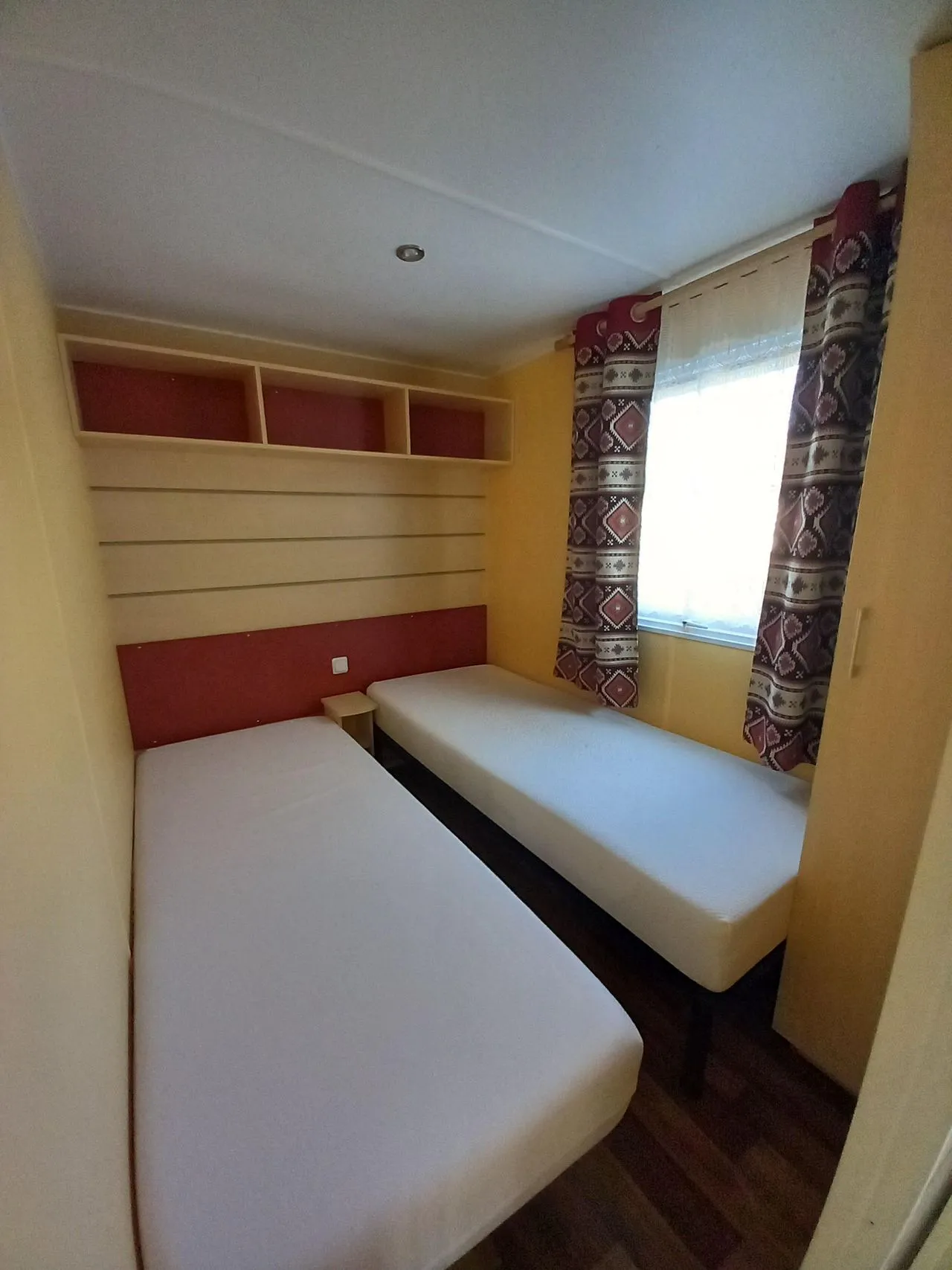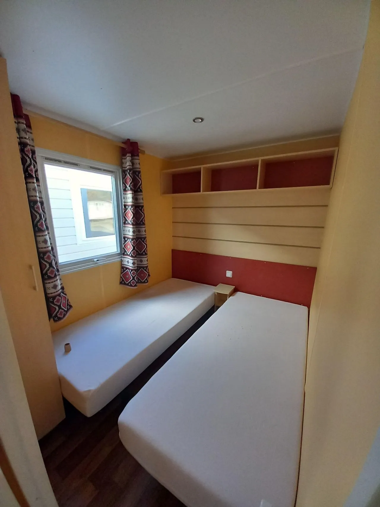 Mobil home d’occasion se composant d’un séjour avec canapé d’angle, d’une cuisine en U avec plaque 4 feux, d’une chambre parents avec un lit de 140X190 communiquant directement avec la salle de bain, de deux chambres enfants avec chacune deux lits de 80X190cm, et d’un wc séparé.